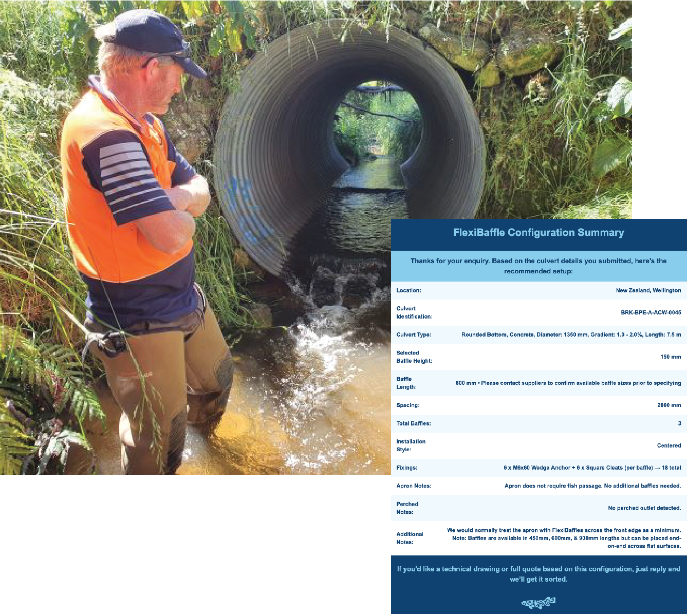 “Installed flexible baffles in culvert—juvenile galaxiid seen migrating days later.”