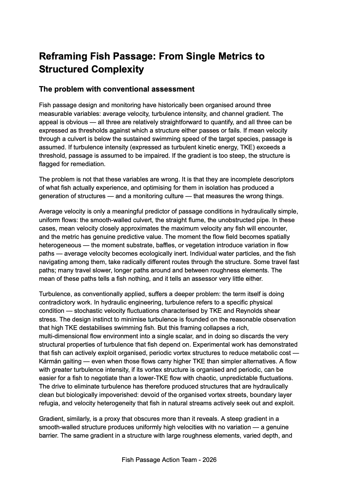 - Document on reframing fish passage – from single metric & meaningless averages to structured complexity.